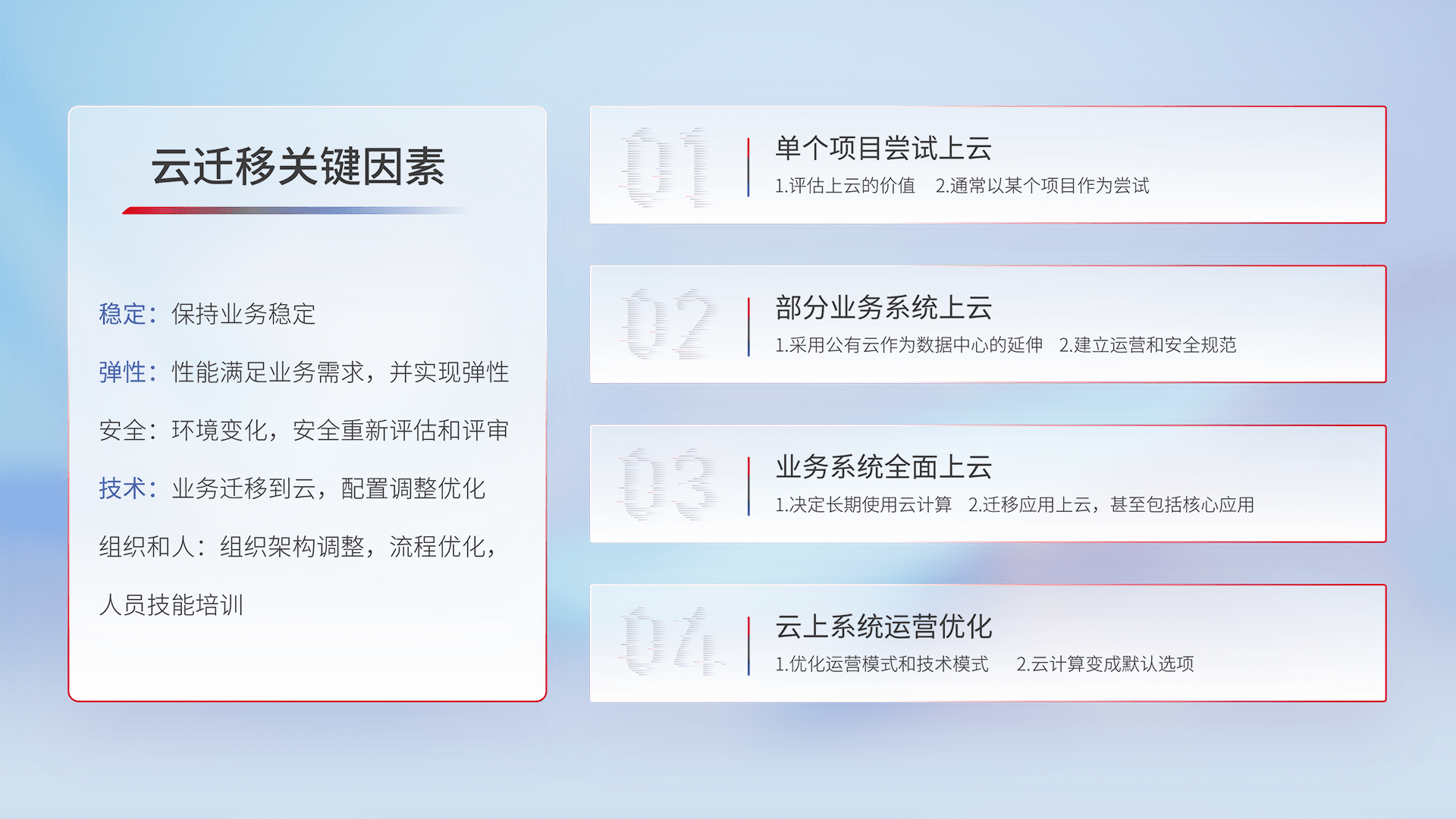 结合实际业务,,,,从规划设计、、、、云平台选型、、、云原生改造、、数据迁移、、、集成交付,,,,迁移全过程为客户识别最佳上云路径,,,,做好风险识别管理,,,设计网络架构、、、、身份权限、、、安全审计合规、、、、操作审计、、日志审计、、、监控告警策略、、多站点容灾设计等,,对云上基础设施进行整体规划,,,,提升IT治理水平,,,以满足弹性、、高可用、、高性能的需求。。。