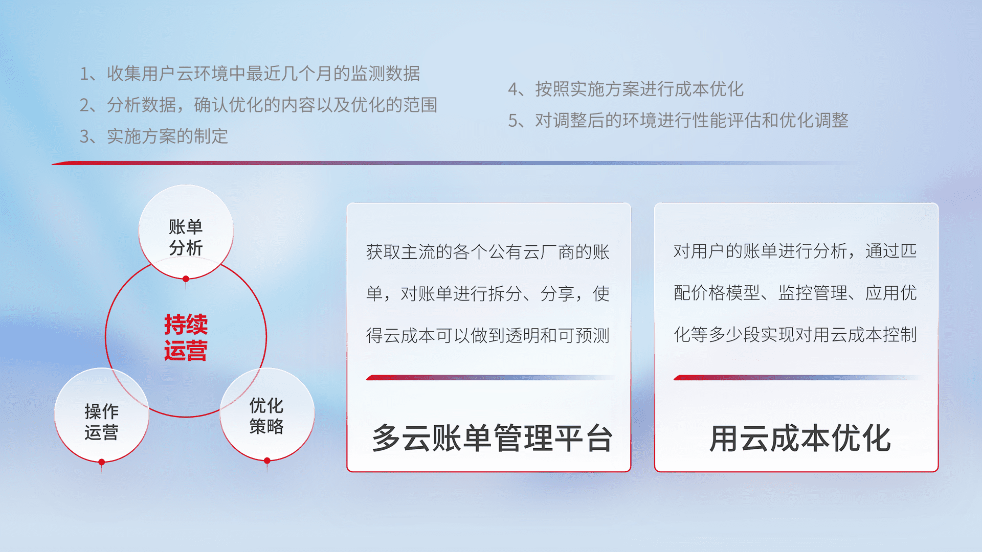 通过多云纳管,,以统一的资源数据模型把客户的云资源进行抽象和封装,,,,进而实现对多云资源的统一操作,,保障云资源管理的可靠性、、、、稳定性与可用性。。。。量身定制化运维内容,,配置、、、开发运维、、、、补丁管理、、、备份、、、、监控、、、认证和访问管理、、审计和日常巡检等,,,,保障在用云过程中的可靠度,,,稳定度以及高可用率。。。。